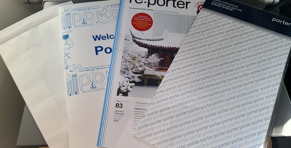 Porter also offers free streaming entertainment through its Wi-Fi connection. I counted approximately 80 movies and 60 television shows, with anywhere from 1 to 8 episodes per show. For some reason though, I was unable to get the streaming entertainment to work. I tried it on both flights and used my phone and laptop but the content player would not start the video. Porter also provides a copy of its in-flight magazine, re:Porter, at every seat.